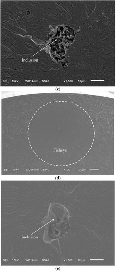 SEM observation of fracture surfaces: (a) Surface defect-induced fracture (σa = 625 MPa, Nf = 300,600); (b) Fisheye in the high cycle fatigue (HCF) regime beyond 107 cycles (σa = 550 MPa, Nf = 18,704,700); (c) Inclusion without fine granular area (FGA, σa = 550 MPa, Nf = 18,704,700); (d) Fisheye in HCF regime below 107 cycles (σa = 550 MPa, Nf = 3,765,500); (e) Inclusion without FGA (σa = 550 MPa, Nf = 3,765,500).