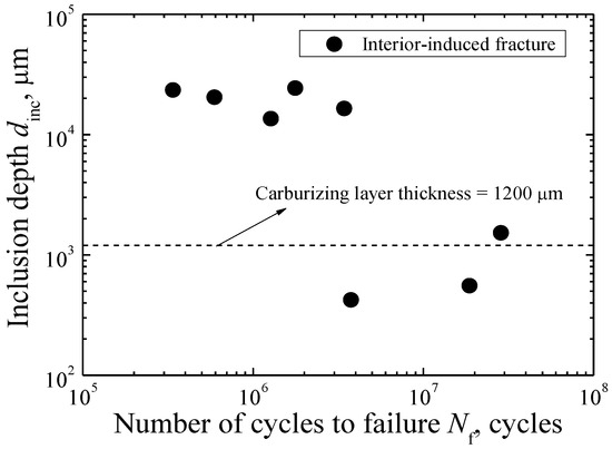 Figure 7 shows the relationship between dinc and Nf. Most of the values of dinc are in the range of 13,546–24,338 μm, and are larger than the thickness of carburized layer, whereas only two values of dinc are less than it. This means that the carburized layer can effectively restrain the possibility of fatigue crack initiation originating from inclusions contained in the layer itself. Furthermore, it can be seen that the values of dinc are almost regardless of fatigue life.