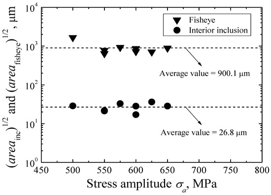 Based on the fractography, several parameters were defined to discuss interior defect/crack geometrical characteristics. The parameter dinc denotes the depth of inclusion from its center to the nearest fracture surface edge. Furthermore, the parameter (area)1/2 denotes the size of the defect or crack, evaluated by the square root of its area. For the inclusion and the fisheye, their sizes are indicated by (areainc)1/2 and (areafisheye)1/2 (including (areainc)1/2), respectively.