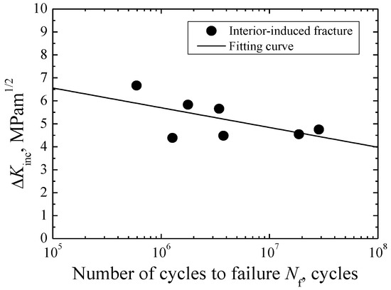 The relationship between ΔKinc and N/areainc1/2 is shown in Figure 11. Combined with the evaluated sizes of inclusion and fisheye, as well as the S-N data, the values of C and m can be obtained. Thus, the interior crack growth rate equation from the inclusion to the fisheye can be expressed as: