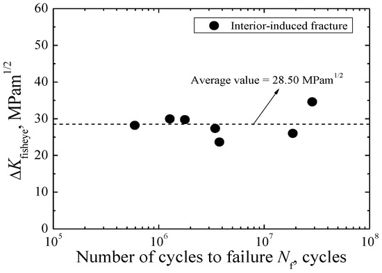 The interior inclusions can be regarded as pre-existing cracks [13], and the shapes of the inclusion and fisheye are approximately circular. Thus, the stress intensity factor range ΔK at the front of the inclusion and fisheye, ΔKinc and ΔKfisheye, can be given by [18]:
