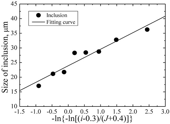 Based on the statistics of extreme values (SEV) presented by Murakami et al. [22], the maximum inclusion size in a given control volume of steel, V (units: mm3), can be predicted. Firstly, it is confirmed that the measured sizes of inclusions observed on the fracture surfaces can be well characterized by the Gumbel distribution, and the corresponding cumulative distribution function F(x) is given by: