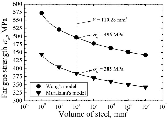 where γ = 3.09 − 0.12logNf for the interior inclusion-induced fracture. Herein, the value of Nf is defined to be 109 cycles. Based on these two models, Figure 14 shows the predicted values of σw as a function of steel volume for carburized 20Cr steel under axial loading.