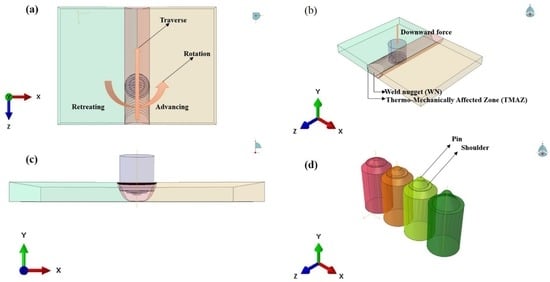 FSW and tool schematics. (a) Top; (b) side; (c) front; (d) tool designs. Images not to scale.