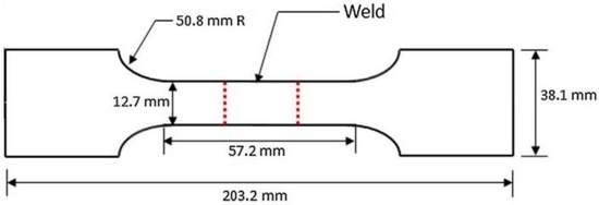 Four tensile coupons were extracted from the as-welded condition. The dimensions of the specimens were in accordance with ASTM E8 (Figure 4). For all specimens, the welds were oriented transversely to the loading direction and the WN was centered in the specimen gage length. All tests were conducted under displacement control at a constant cross-head extension speed of 1.27 mm/min. Every sample was tested to failure. The load data was monitored by a load cell built into the load frame. The axial strain data was monitored by a clip-on extensometer (Model number: 2650-562, Instron Industrial Products, Grove City, PA, USA), which was removed at the onset of yielding to prevent damage at failure and the test was allowed to run to failure with elongations in the plastic portion of the stress strain curve measured by the cross-head of the load frame. In each test, the yield and ultimate strengths were recorded in addition to the elongation at failure and failure location.