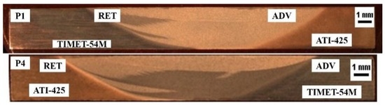 Typical macrographs of butt welds, (P1) ATI-425 on the advancing side, and (P4) TIMET-54M on the advancing side. RET: Retreating; and ADV: Advancing side.
