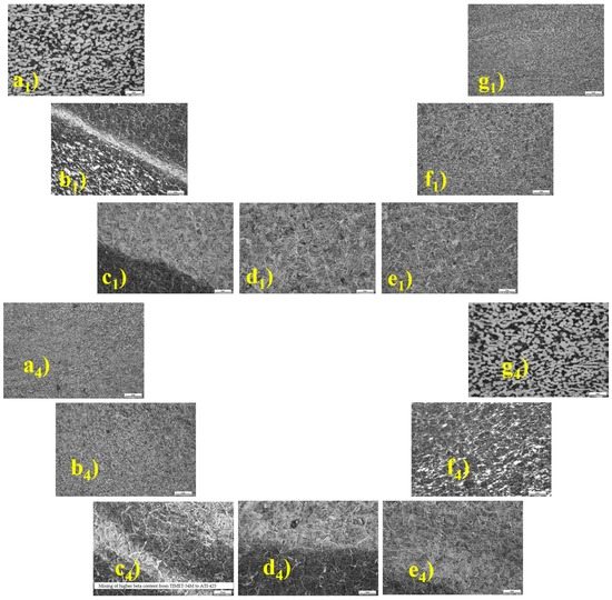 The microstructures were taken at the locations as prescribed in Figure 6. Position a, and g correspond to the base material. Locations b, and f correspond with the TMAZ/HAZ on the retreating and the advancing side, respectively. Location g corresponds with the center of the WN. Locations c, and e are in the vicinity of the boundary inside the WN on the retreating and the advancing side, respectively. Subscripts 1 and 4 in the microstructures corresponds with the specimen P1 and P4, respectively.