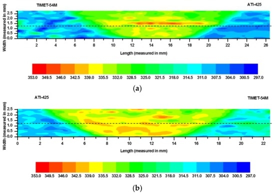 From Figure 8, it can be seen that TIMET-54M has shown relatively higher hardness in comparison with ATI-425 for BM; the reason being, the base material microstructure of the TIMET-54M contains equiaxed α grain presenting a higher flow stress in comparison with the ATI-425, where α is infused with primary β. Hardness in the WN increases for both cases. The hardness values are significantly fluctuating inside, and around, the WN. In the case of P1, when TIMET-54M, with a lower β transus temperature, was kept on the retreating side, the increase in the hardness on the boundary of the retreating side is a result of finer acicular α in refined prior β grains in comparison with refined α grains on the advancing side of P1. The higher values of hardness on the retreating side for P1 are in correspondence with the microstructure observed (Figure 7b1). Upon close inspection one can observe a very distinctive fine streak in the center of the weld in the macrograph of P1 (Figure 5). The higher values of hardness in that region are also observed in Figure 8a.