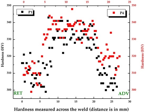 - As such, no uniformity can be conformed based on the evolution of the microstructure but, for the case of P4, higher values of hardness have been observed on the retreating side suggesting that grain refinement is more dominant in comparison with the finer acicular α formation.