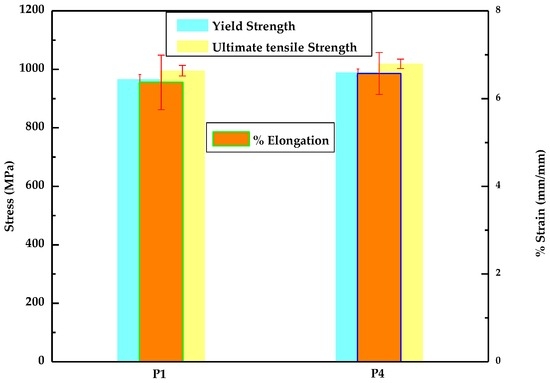 From tensile data, as plotted in Figure 10, extracted from global stress strain curves for four specimens of each case, it can be observed that P4, when ATI-425 is on the retreating side, showed higher values of YS and UTS in comparison to P1, when TIMET-54M is on the retreating side. In all of the cases, out of four specimens tested for the analysis, the fracture always occurred on the retreating side. For the case of P4, where the hardness in the WN is slightly higher in comparison with that of P1, it can be said that residual stresses are slightly more compressive [40] giving rise to higher values of YS and UTS. The residual stresses are not measured, however, due to migration of the elements, Al, V, and Fe, the titanium atoms in the bcc (β) and hcp (α) phases are replaced by these elements causing the shrinkage or expansion of the lattice spacing. Further research with transmission electron microscopy (TEM) needs to be done in order to confirm the results as presented during our findings in order to verify the detailed phase transformation and the true nature of deformation. As it appears from the microstructure, it can also be said that if a titanium alloy of lower β transus is kept on the advancing side (P4, in our case, with TIMET-54M on the advancing side) it results in the formation of a basket-weave morphology (refined β grains with finer acicular α) inside the WN that, as a part of entire gage length (if measured in a transverse tensile test for global stress strain curve), assists in achieving superior values of mechanical properties.