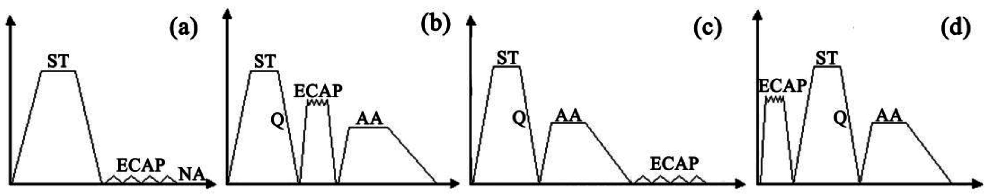 Scheme of thermomechanical treatment. ST—solution treatment, ECAP–equal channel angular pressing, NA—natural aging, Q—Quenching, AA—artificial aging. (a) ECAP between ST and NA; (b) ECAP between ST and AA; (c) ECAP after ST and AA; (d) ECAP before ST and AA.