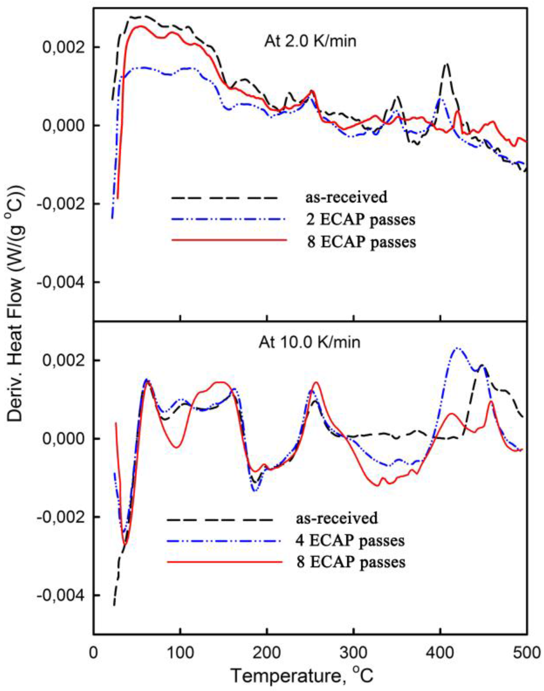 The second and third exothermic peaks are usually attributed to precipitations of the δ′-phase and S1-phase [33], respectively. It is worth noting that precipitation reactions in the 1421Al subjected to ECAP are shifted to lower temperatures. In contrast, the 1421Al subjected to ECAP up to a total strain of ~8 shows one exothermic peak at 120 °C–180 °C. This peak can be interpreted in terms of precipitation of S1-phase. However, it is necessary to keep in mind that these DSC experiments are merely indications, and they cannot prove or disprove the formation of different phases.