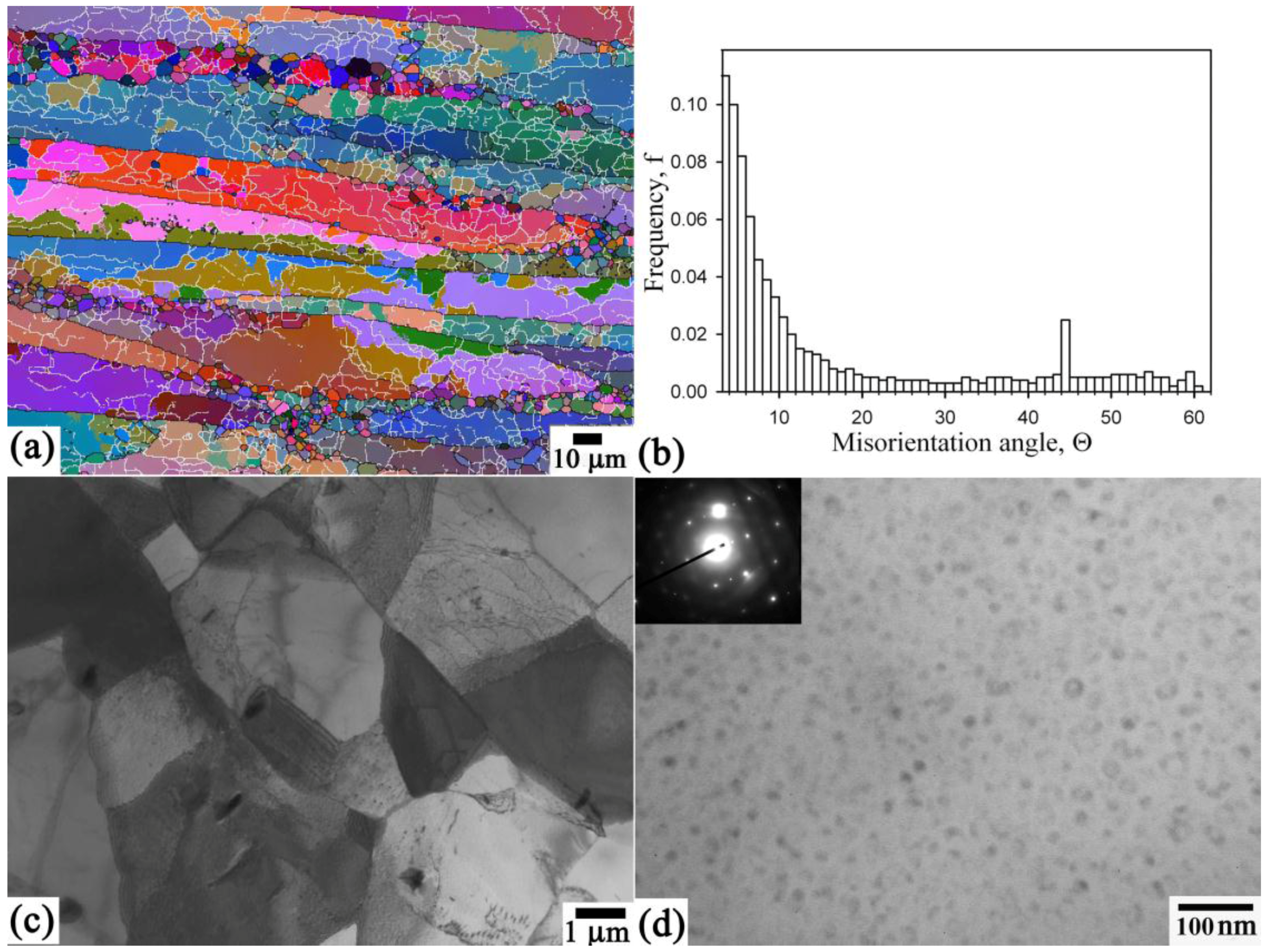 Typical microstructures of the 1421Al as-received and after standard heat treatment: (a) misorientation map; (b) distribution of misorientations; (c) transmission electron microscope (TEM) image of structure; and (d) δ′-phase particles (TEM).