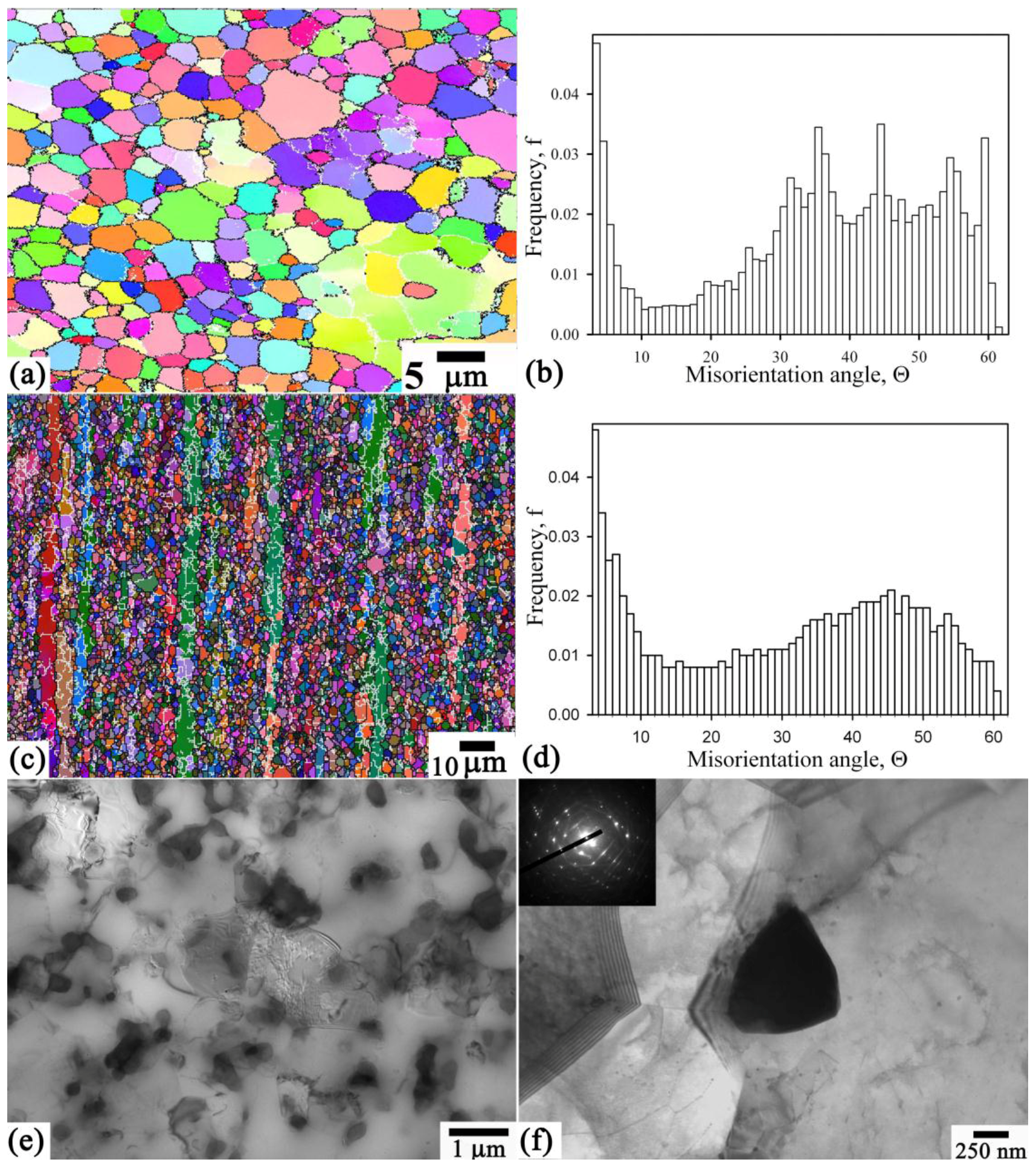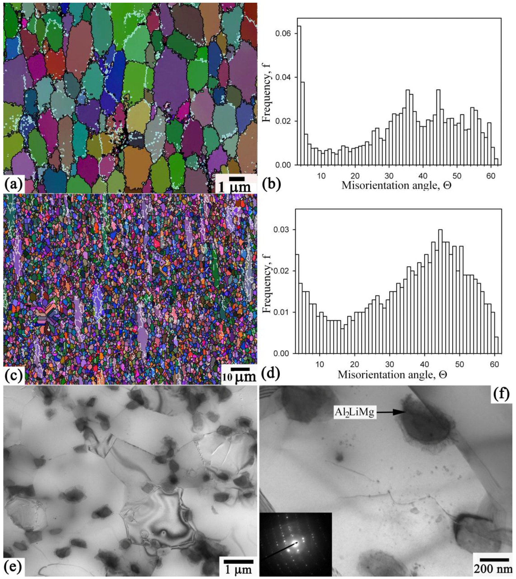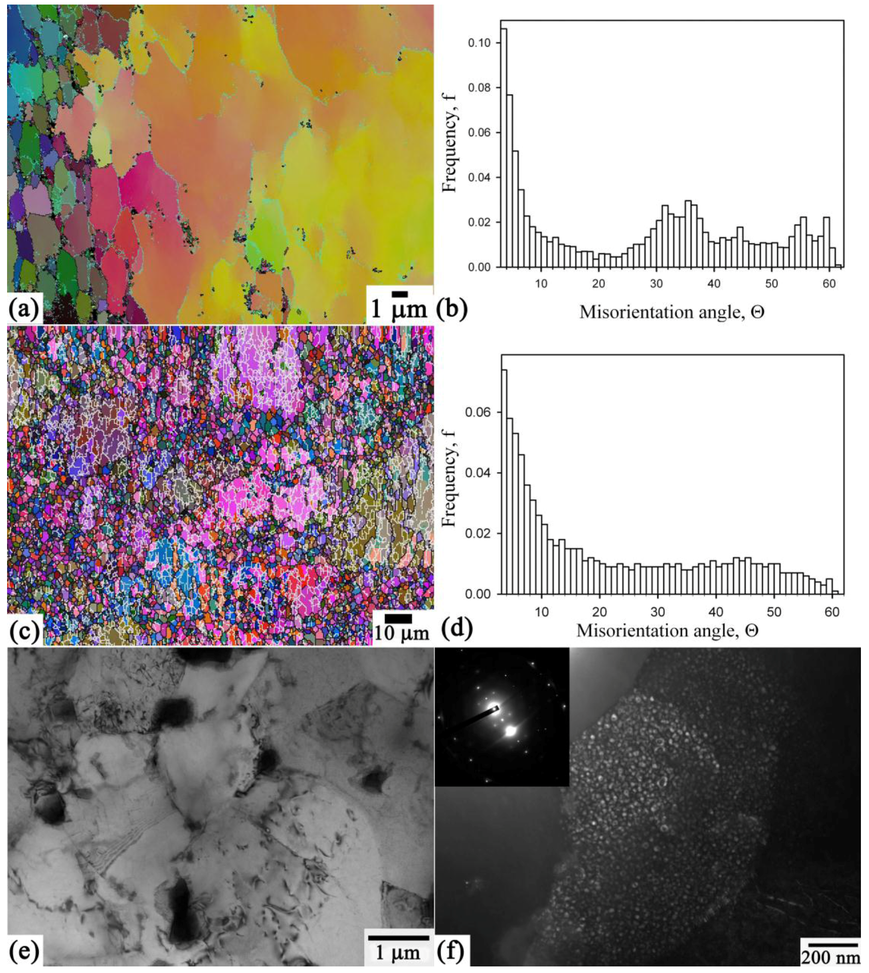 (a,c) Electron back scattering diffraction maps showing the high and low angle boundaries (dark and light lines, respectively) and boundary misorientation histograms (b,d) for the 1421 alloy deformed by equal-channel angular pressing to strains of (a,b) 8; (c,d) 8 and standard heat treatment; and (e,f) transmission electron microscope image of structure ε~8 and standard heat treatment.