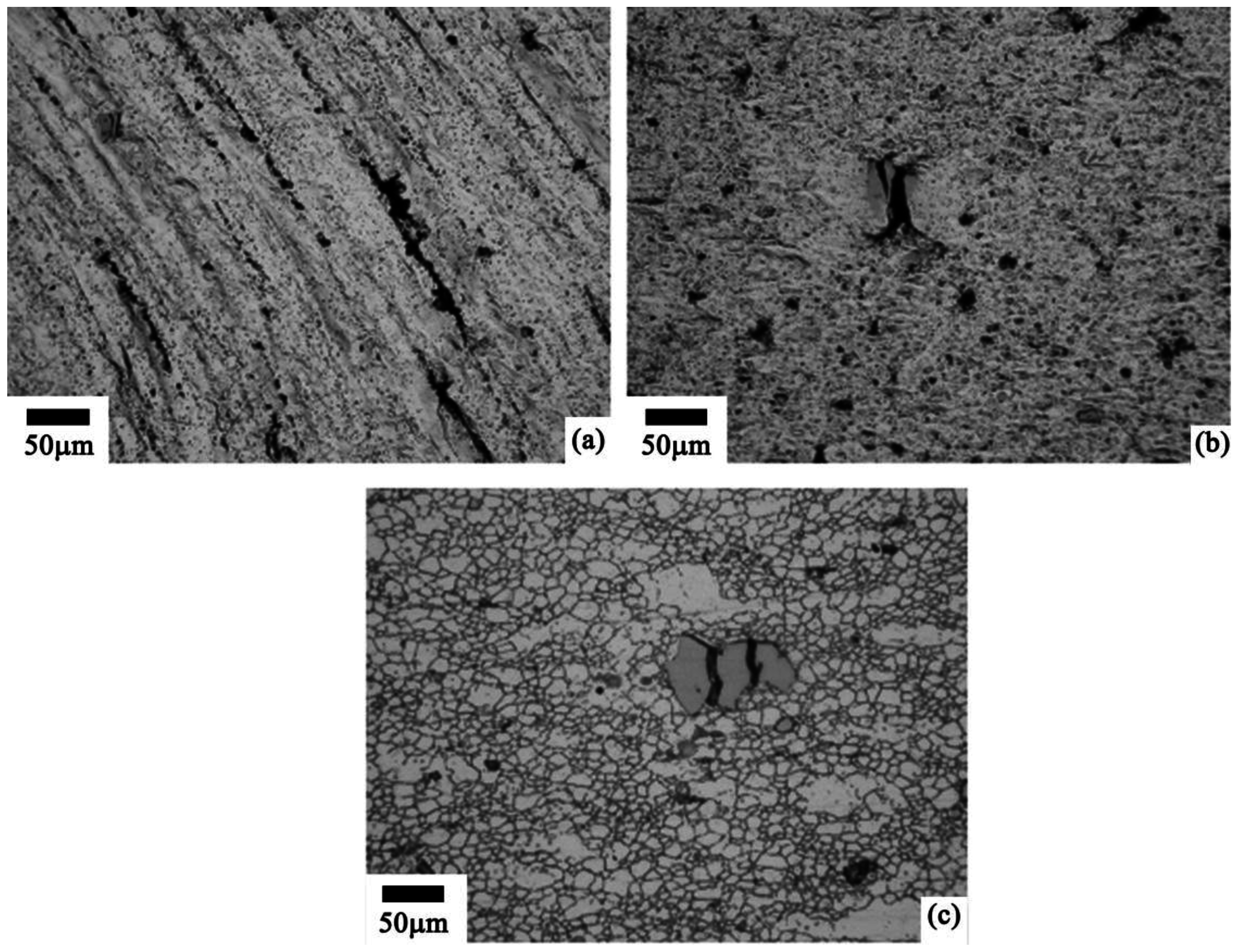 Microstructural observations of the samples strained up to failure showed that there exist two types of crack initiation. In the samples subjected to ECAP with ε~2, the crack nucleation occurs in the vicinity of coarse S1-phase particles comprising chains (Figure 8a). As a result, an interlinkage of cracks easily occurs resulting in premature fracture. In the samples subjected to ECAP with ε~4, most of the coarse S1-phase particles dissolved and separate particles of this phase are distributed uniformly in the aluminum matrix. Crack nucleation occurs in the vicinity of these particles (Figure 8b) or primary precipitations of Al3(Sc,Zr)-phase (Figure 8c). However, no crack interlinkage takes place (Figure 8b,c); this material exhibits increased ductility.