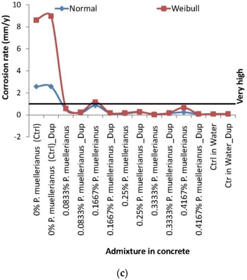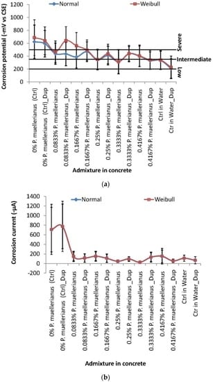 Figure 1 shows the mean plots, obtained from the statistical analyses of corrosion test-variables from each sample by the Normal and the Weibull distributions, for the corrosion potential Figure 1a, corrosion current Figure 1b and corrosion rate Figure 1c. The mean plots of corrosion potential and corrosion current, Figure 1a,b, also include the range of standard deviations for each of the datasets of these corrosion test-variables for each steel-reinforced concrete samples. In addition, and for aiding direct interpretations from the plotting, the plots of corrosion potential (Figure 1a) include linear plots of corrosion risk probability as per ASTM C876-91 R99 [45] while the plots of corrosion rate (Figure 1c) include a linear plot of typical corrosion rate criteria from literature [18,67].