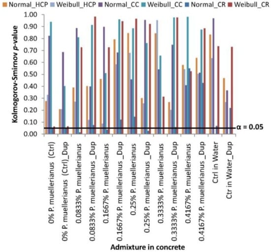 Figure 2 therefore shows results of the Kolmogorov-Smirnov goodness-of-fit (K-S GoF) analyses of the scatter of the dataset of corrosion test-variables, from each sample of steel-reinforced concrete employed in this study, like the Normal and like the Weibull distribution. The plots in Figure 2 also include linear plot of α = 0.05 level of significance for ascertaining analyzed dataset scattering like, or otherwise, each of the distribution fitting models. These showed that all the datasets of corrosion potential and of corrosion current scattered like both the Normal and the Weibull probability distributions according to the K-S GoF criteria at α = 0.05 level of significance. However, datasets of corrosion rate from six steel-reinforced concrete samples, out of the 14 samples studied and which include datasets from the duplicates of normal control (Ctrl and Ctrl Dup), were not scattered like the Normal distribution. In contrast, all datasets of corrosion rate scattered like the Weibull distribution. These results indicate that while both the Normal and the Weibull distributions could be employed for describing the corrosion potential and the corrosion current, only the Weibull distribution, but not the Normal, could be used for describing the corrosion rate test-data.
