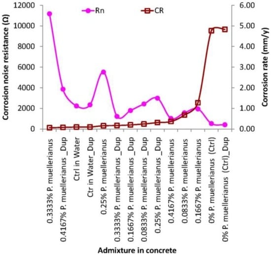 Plots of noise resistance and corrosion rate in ranking order of corrosion rate performance of P. muellerianus admixtures in concrete samples.