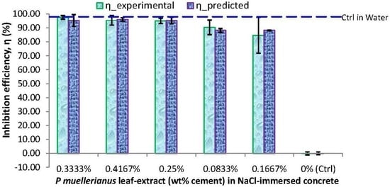 Plots of inhibition efficiency are presented in Figure 4, in ranking order of the P. muellerianus leaf-extract performance on concrete steel-reinforcement corrosion in the tested medium, using the experimental and the correlation predicted CR data applications to Equation (9). For further comparisons of corrosion effects, the figure also includes a linear plot of the analyzed corrosion rate reduction effect from the positive control (“Ctrl in Water”), idealized as inhibition efficiency relative to the normal control (Ctrl), through use of Equation (9). By these, therefore, it could be deduced from the figure that the P. muellerianus leaf-extract concentrations effectively inhibited steel-reinforcement corrosion in concrete immersed in the chloride contaminated environment. However, in addition to these, the inhibition efficiency performance of the P. muellerianus leaf-extract concentrations tended towards that of the “Ctrl in Water” by both the experimental and the predicted models of corrosion. Thus, while the 0.3333% P. muellerianus leaf-extract exhibited optimal inhibition efficiency, η = 97.58% ± 1.28% (experimental) or 95.33% ± 4.25% (predicted), this inhibition effect ranged towards that of the idealized inhibition efficiency, η = 97.96% ± 0.03%, by the “Ctrl in Water”.