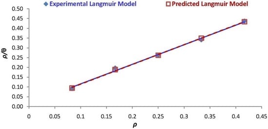 Figure 5 shows plots of the results obtained from fitting the experimental and the correlated predicted data to the Langmuir adsorption isotherm, through requisite applications of Equations (8) and (10), while Table 3 presents the adsorption fitting parameters. In the figure, the ratio of P. muellerianus concentration to the surface coverage model (ρ/θ) was plotted, as the ordinate, against the concentration (ρ) of the plant extract, as the abscissa, for obtaining the intercept 1/Kads, the reciprocal of the Langmuir equilibrium constant, as per Equation (10). Figure 5 shows that both the experimental and correlation predicted data linearly fit the Langmuir adsorption isotherm model, which by their R > 99% correlation coefficients, as tabulated, interpret also to excellent isotherm modeling efficiency. The values of the separation factor that were in the range 0 < RL < 1 indicate favorable adsorption [60,66] by the P. muellerianus leaf-extract inhibitor on the concrete steel-reinforcement. In addition, the negative values of Gibbs free energy of adsorption indicate spontaneity of the P. muellerianus leaf-extract adsorption while the values of the parameter around –20 kJ/mol imply prevalent physisorption as the mechanism of P. muellerianus leaf-extract adsorption on the reinforcing-steel surface.