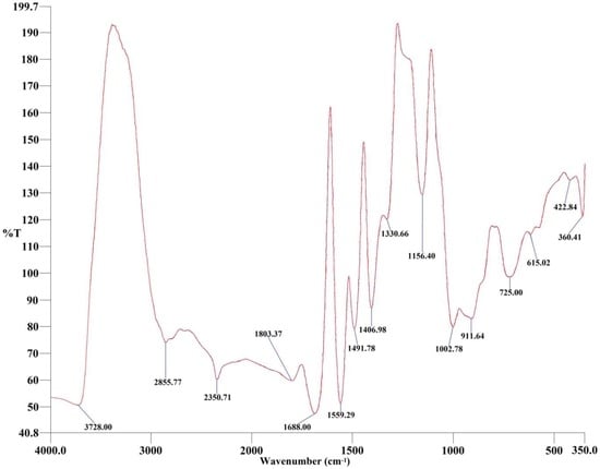 The effectiveness of P. muellerianus leaf-extract on the corrosion protection of reinforcing steel in the chloride contaminated medium engender interest in the bio-constituent model that could be available in the leaf-extract of the natural plant [56]. For this, the spectrum obtained from the Fourier Transform Infrared (FT-IR) spectroscopy instrument, the Perkin-Elmer® FT-IR System (Spectrum BX, Waltman, MA, USA), application to the P. muellerianus leaf-extract is presented in Figure 6.