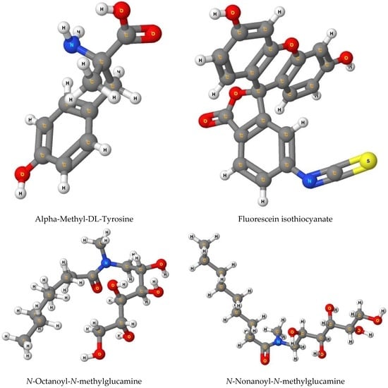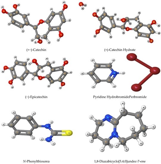 As had been previously detailed, the functional classes of adsorbed vibrations, for the identified frequencies in the P. muellerianus leaf-extract FT-IR spectrum (Figure 6), had been reported, along with the phytochemical characterization, by [33]. However, the rendering of this FT-IR spectrum to the Euclidean Search of the Fluka library, by the Perkin-Elmer® instrument [72], suggested hit list of 10 organic compounds that are presented, in this study, as 3-D optimized structures of the compounds in Figure 7.