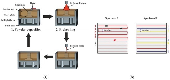 Schematic illustration of SEBM procedure: (a) SEBM processing steps; and (b) two types of scan strategies referred to as line order 1 (Specimen A) and 5 (Specimen B), and their subsequent processing steps.