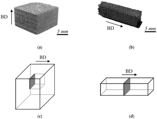 SEBM specimens investigated in the present work, where the arrows indicate the build direction (BD) of the SEBM blocks: (a) Specimen A; and (b) Specimen B. (c,d) Schematic illustration of locations where samples for microstructural characterization were taken out: (c) sample taken out from Specimen A; and (d) sample taken out from Specimen B.