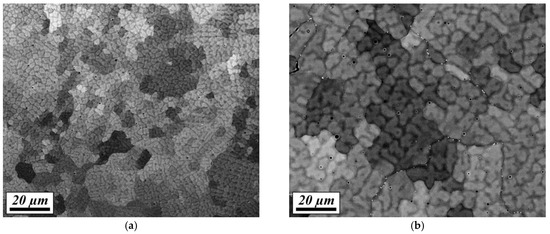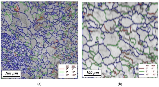 EBSD data can be analyzed to determine tilt axis/tilt angle pairs, which can be used to describe the misorientation between two crystallites (Figure 5) [16,17]. Figure 5 shows images where grain boundary misorientations are superimposed onto the IQ maps shown in Figure 4b,e. In Figure 5, one can differentiate between three color coded angular groups. Misorientations smaller than 2° are not highlighted. Low angle misorientations between 2° and 5° are marked in red. Green lines indicate misorientations between 5° and 15°. Misorientations larger than 15° are shown in blue.