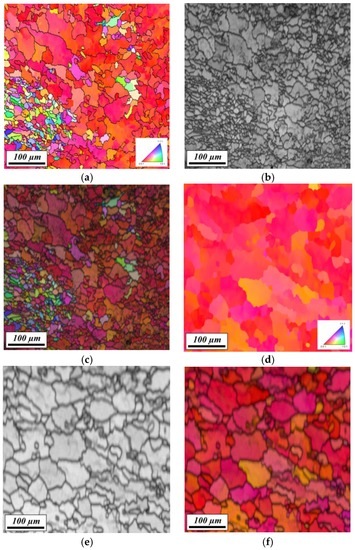 EBSD results: (a–c) SEBM Specimen A; (d–f) SEBM Specimen B; (a,d) IPF-maps; (b,e) IQ-maps; and (c,f) combined IPF/IQ-maps.