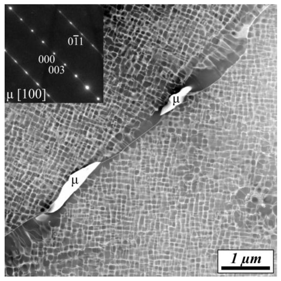 Figure 7 shows a STEM micrograph of small particles highlighted by white horizontal arrows in Figure 6b,d at a higher magnification. The particles appear in a microstructural environment that mainly consist of a dark γ′ phase region which extends along the boundaries. The fact that this dark region is γ′ phase was proved by selected area electron diffraction (not shown here). The small brighter particles were identified as µ phase particles using selected area electron diffraction (SAD). The inset in the upper left of Figure 7 represents an indexed SAD pattern of the µ phase particle in the lower left of Figure 7. This figure suggests that the particles line up along the boundary, always in contact with the dark γ′ phase.