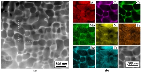 Distribution of alloy elements in the SEBM microstructure of Specimen A. (a) STEM-HAADF image of the γ/γ′ microstructure (200 nm scale); multiple beam condition, beam close to [001] crystallographic direction; (b) Corresponding element distribution maps, color coded as indicated.