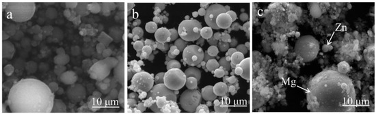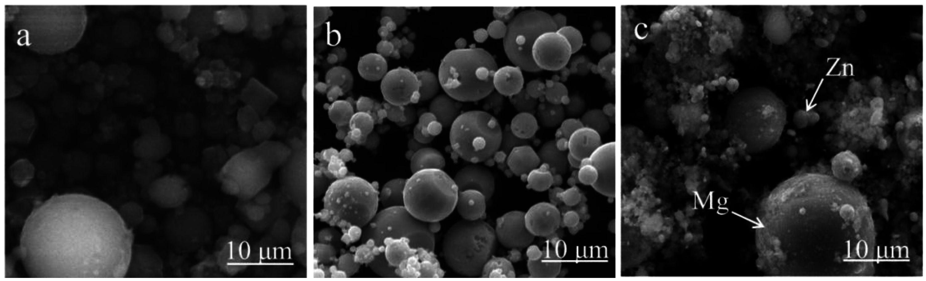 The original powder: (a) Mg; (b) Zn; and (c) mixed powder.