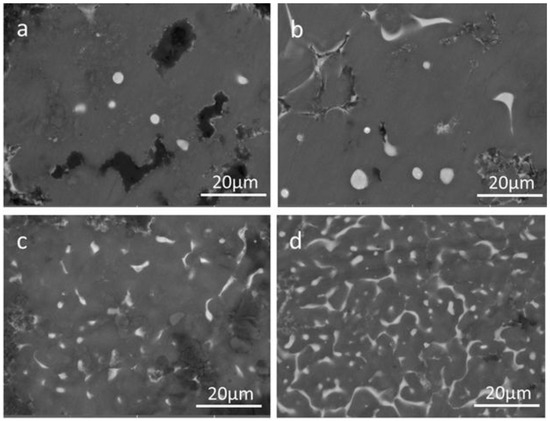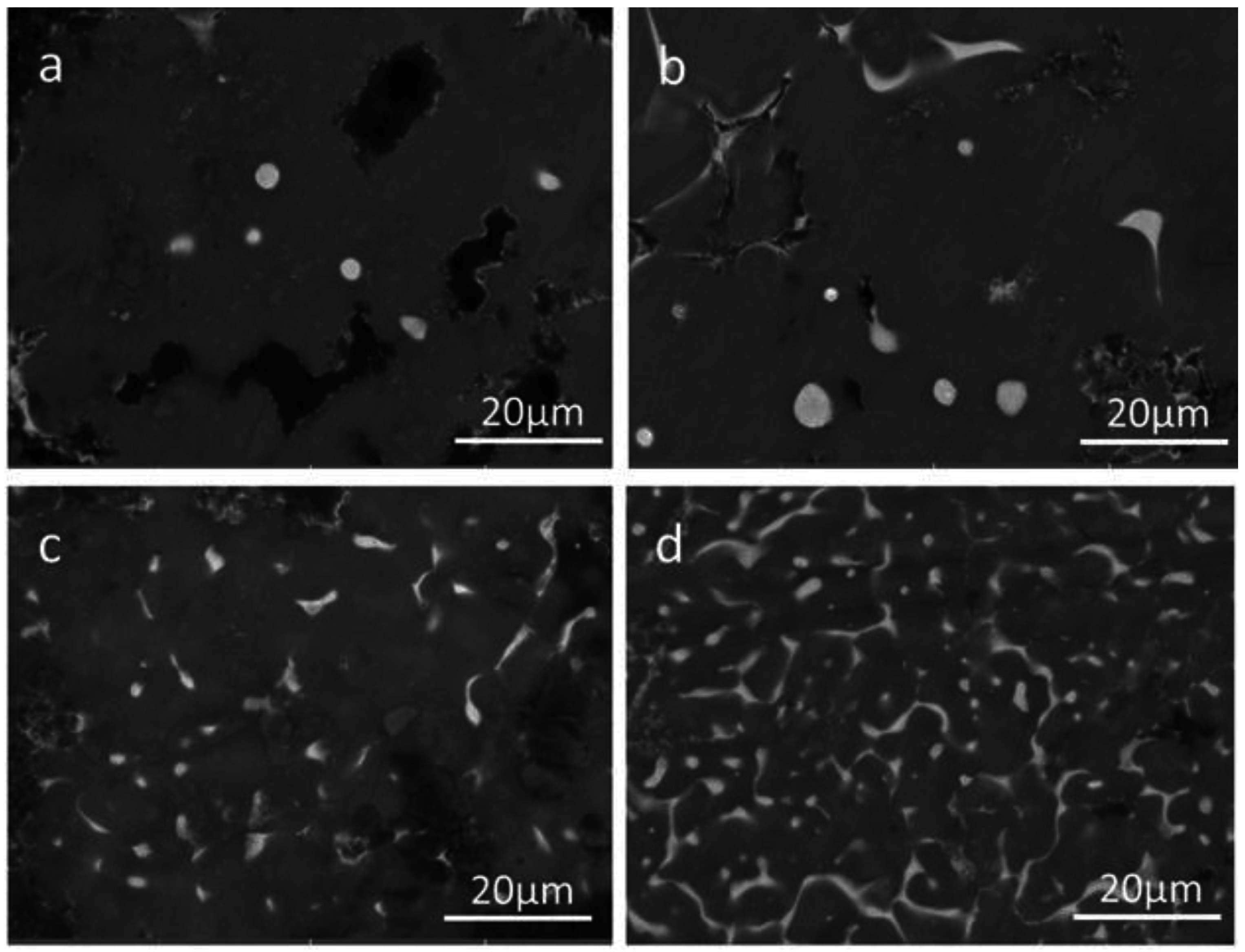 SEM micrograph of the Mg-Zn alloys: (a) Mg-2Zn; (b) Mg-4Zn; (c) Mg-6Zn and (d) Mg-8Zn.