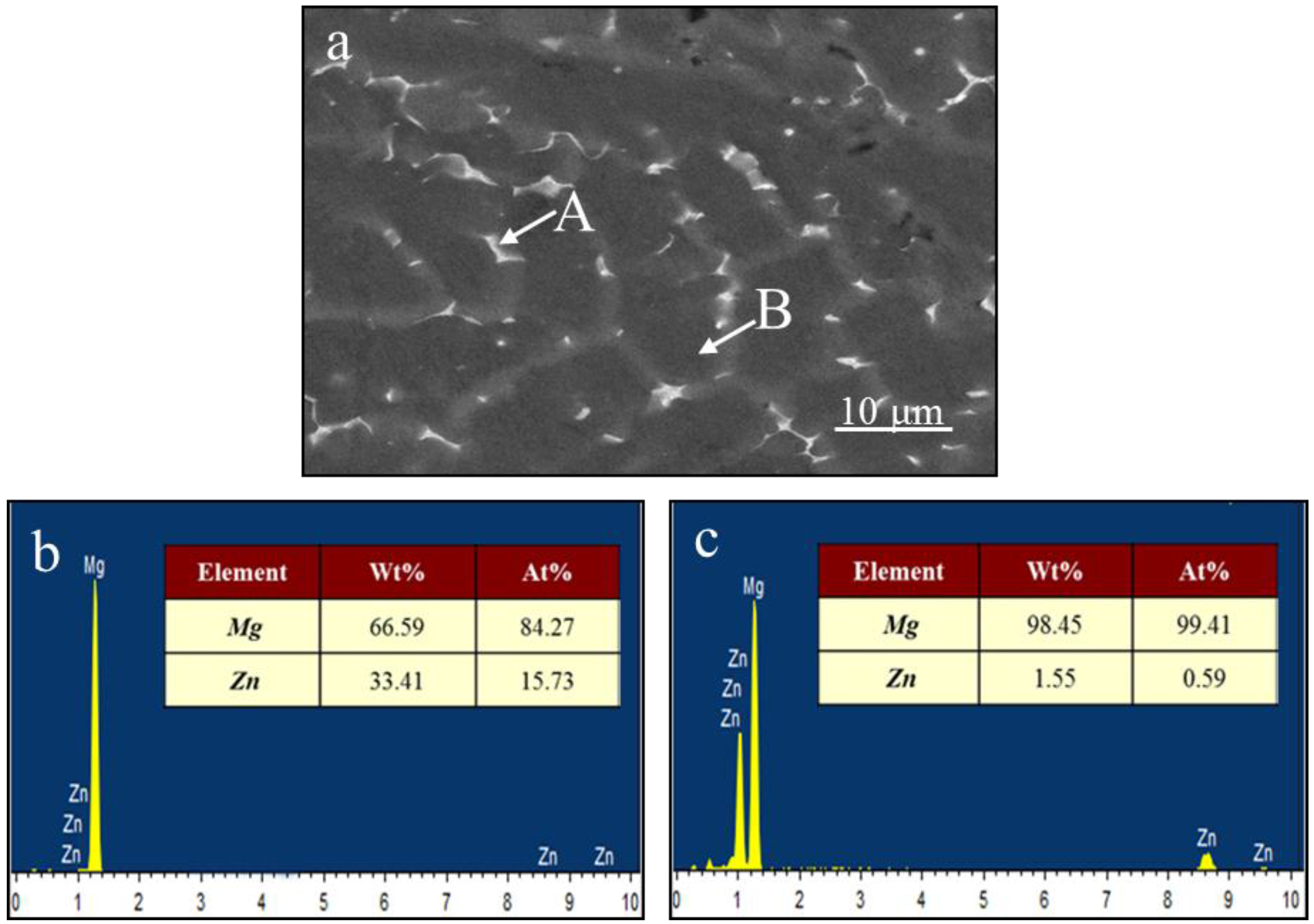 The backscattered electron mode in the SEM was used to further investigate the size, volume percent, distribution, and shape of the secondary phases in the alloys. Owing to the different atomic number between Mg and Zn, the images clearly show that Mg-2Zn mainly contained the α-Mg phase (Figure 3a), while the Zn-rich second phase could be detected in Mg-6Zn and Mg-8Zn alloys (Figure 3c,d). As shown in Figure 3, the light area corresponds to the second phase. The dot-like second phase appeared along the grain boundary when the Zn content was not over 4%. In Mg-6Zn alloys, the second phase dispersed at the grain boundary, while it formed a reticular structure with the Zn content up to and over 8 wt. %. These results indicate that the size and volume percent in the second phase both increased as Zn increased. The microstructure of the etched alloy and the EDS analysis were shown in Figure 4. The results revealed that area B, which existed in the inner grain, was composed of 98.45 wt. % Mg and 1.55 wt. % Zn, whereas area A which existed in the grain boundary was composed of 66.59 wt. % Mg and 33.41 wt. % Zn. Thus, it was reasonable to conclude that the Zn-rich second phase distributed along the grain boundaries.