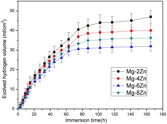 The relationship between the variation of the hydrogen volume and immersion time is shown in Figure 6. It was found that the evolved hydrogen volume rapidly increased during the initial three days, then slowed down and stabilized after five days. Besides, after immersion for seven days, the evolved hydrogen volume of Mg-6Zn (32.2 mL/cm2) was lower than that of Mg-2Zn (47.1 mL/cm2), Mg-4Zn (40.3 mL/cm2) and Mg-8Zn (36.4 mL/cm2).