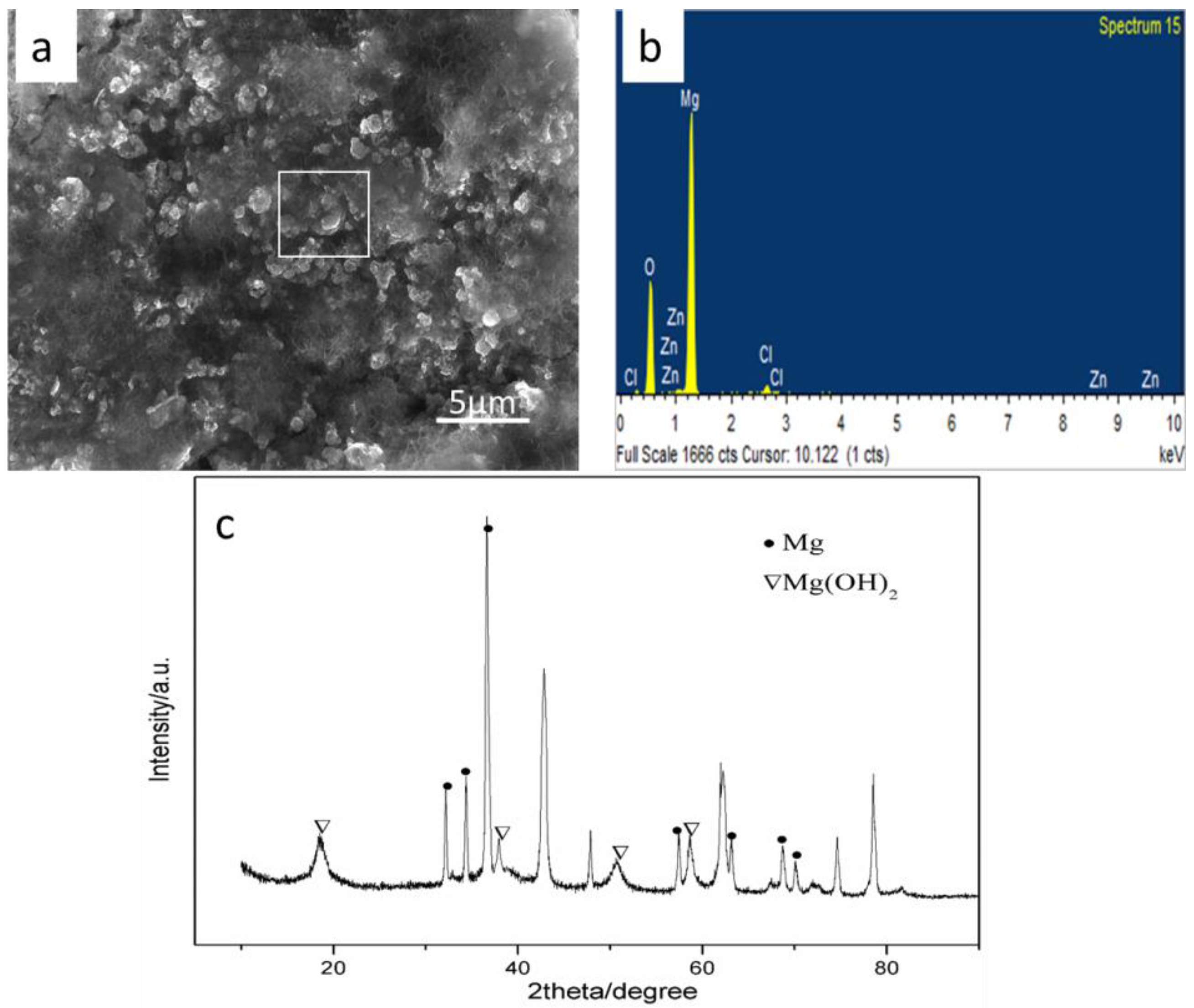 Corrosion products of the Mg-6Zn in SBF: (a) surface morphology; (b) composition analysis of EDS; (c) XRD identification.