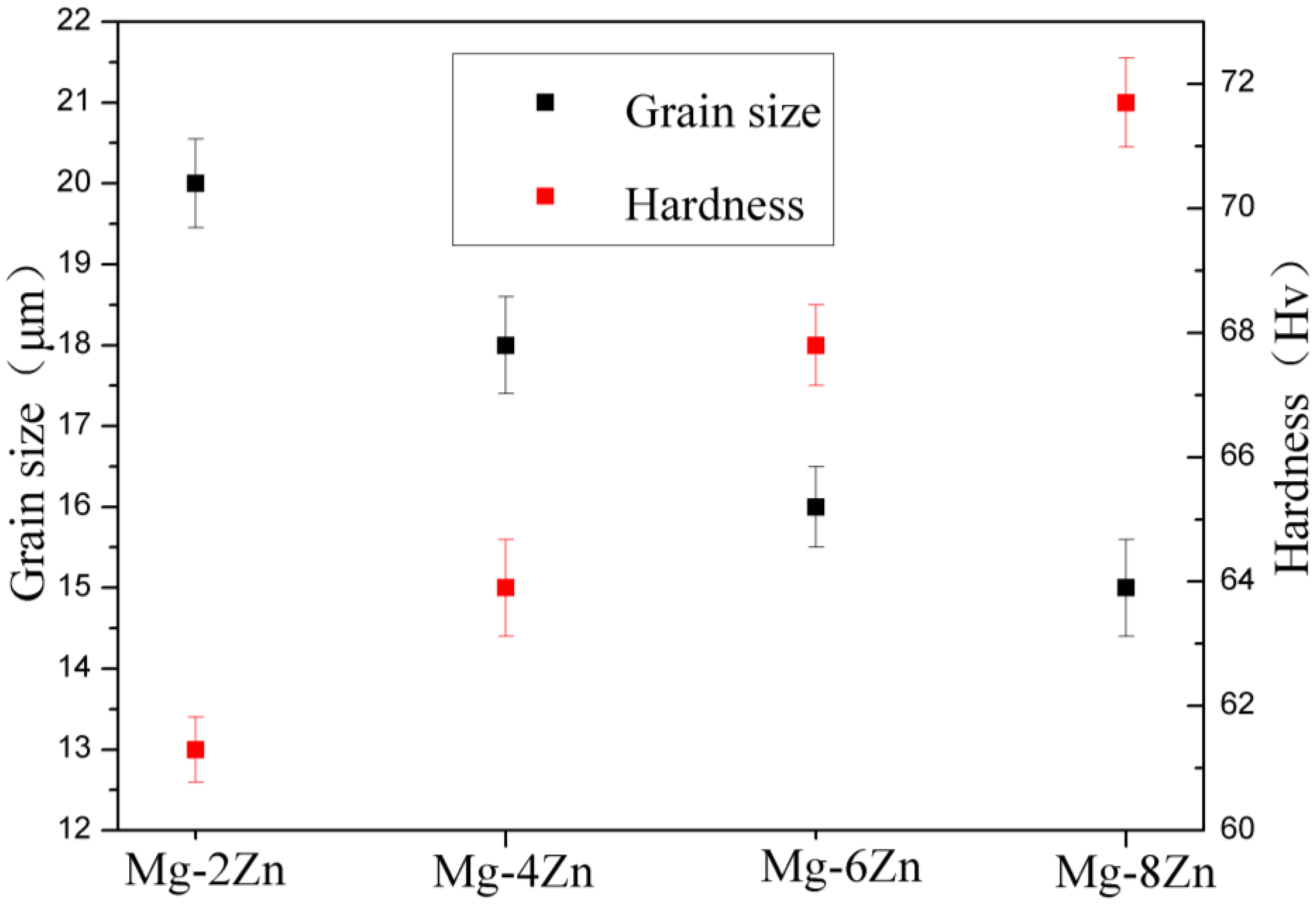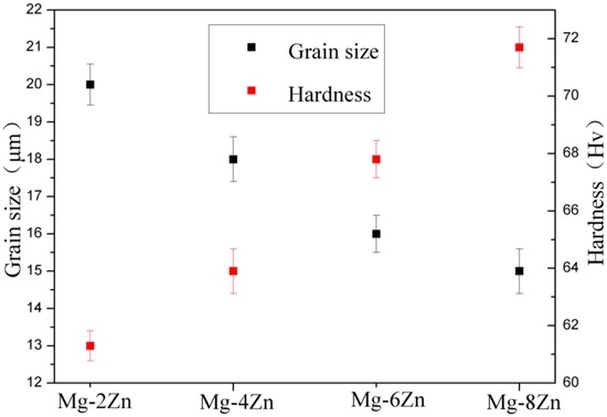 XRD was used to analyze the phase composition of the Mg-Zn alloys (Figure 5). Strong α-Mg peaks were detected in Mg-xZn (x = 2, 4, 6 and 8 wt. %) alloys, while weak peaks corresponding to MgZn were clearly detected in Mg-6Zn and Mg-8Zn alloys. Furthermore, the peaks’ intensity of MgZn phase became stronger as the Zn content increased (Table 2), implying that the volume percent of the MgZn phase increased. The peaks of MgZn were barely detectable in Mg-2Zn and Mg-4Zn, because the quantity of Zn was too small to be detected. This phenomenon also explains why there was little dot phase in Mg-2Zn and Mg-4Zn (Figure 3).