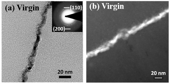 All cross-sectional TEM specimens were prepared by conventional dimple, grinding, and polishing, followed by an ion milling process. A low energy (3.5 keV) and a low angle (5°) were used to minimize the ion milling damage in sample preparation. The microstructure of SiOC/Fe/SiOC marker specimens before and after irradiation was characterized by a Tecnai G2 F20 microscope (Field Electron and Ion Co., Hillsboro, OR, USA) with an operation voltage of 200 keV. The microstructure of marker specimen after pure heat treatment was also examined. Depth-dependent damage and defect concentration profiles were calculated by the Stopping and Range of Ions in Matter (SRIM)-2008 using the ion distribution and quick calculation of damage option [30]. The displacement energies for Fe was taken as 40 eV. The recoil distribution of Si and Fe elements at the Fe/SiOC interface were simulated by using the detailed calculation with the full damage cascades option.