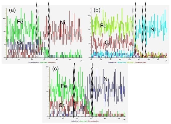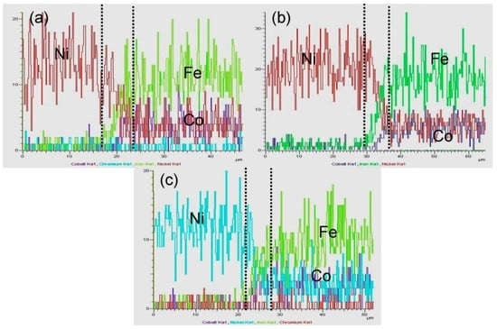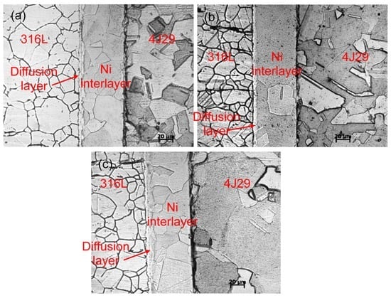 Figure 4a–c presents the concentration profiles of the elements at the interface of the Ni interlayer and the 4J29 side bonded at 850 °C, 900 °C, and 950 °C for 120 min. The concentration of Fe, Co, and Ni at the interface markedly declined. By comparison, the width of the diffusion layers did not evidently change as temperature increased, in accordance with metallurgical research. The different widths of the diffusion layers between the Ni–316L side and the Ni–4J29 side is partly attributed to the different grain sizes of the parent materials. The fine grains of the 316L stainless steel side possessed more grain boundary than the coarse grains of the 4J29 Kovar alloy side, which benefits the diffusion of atoms [23]. Thus, wider diffusion layers were obtained at the Ni–316L side.