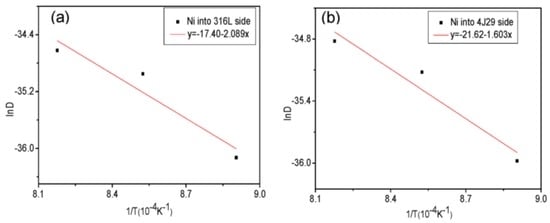 where D0 is the diffusion constant (m2/s), Q is the activation energy for diffusion (kJ/mol), R is the real gas constant (8.314 J/mol), and T is the bonding temperature (K). Based on Equation (4), the activation energy for the diffusion of Ni can be calculated for the guidance of the parameter controlling the extent of diffusion. Curves of the diffusion coefficient vs. the temperature are exhibited in Figure 6. According to the slope of the plot in Figure 6a,b, the activation energy for the diffusion of Ni into 316L and 4J29 is 173.68 kJ/mol and 133.27 kJ/mol, respectively.