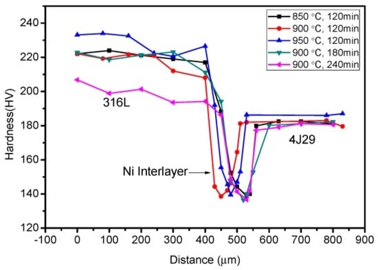 Figure 8 shows the variation in micro-hardness of the bonded joint at different parameters. The hardness of the interface distinctly decreased on both sides of the 316L stainless steel and the 4J29 Kovar alloy, and the lowest hardness appeared at the Ni interlayer because of its excellent plasticity, which is a benefit for releasing the stress derived from the significant difference of expansion coefficients between parent metals. By comparison, the hardness distribution and the tendency of the bonded interface did not apparently change with parameters. It was observed that the hardness of the 316L side was a small reduction, which may be due to the aging and tempering treatment of the austenitic stainless steel at 900 °C for 240 min.