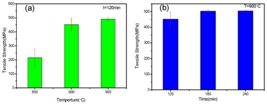 Variation in the mechanical properties of the bonded joints processed at different parameters is shown in Table 4 and Figure 9. At 850 °C and 900 °C for 120 min, some joints were fractured at the interface on account of the insufficient creep deformation to form a compact diffusion layer. When the joints were bonded for 120 min, tensile strength gradually increased as temperature increased. At the same time, the stability of the joints significantly improved, as shown in Figure 9a, which was due to a more sufficient diffusion and bonding between the parent metals and the Ni interlayer. When the joints were processed at 900 °C, the mechanical properties rarely changed after heat preservation beyond 180 min, which means that the width of the diffusion layer was enough to form an excellent joint. Moreover, the highest tensile strength of 504.91 MPa with an elongation of 38.75% was obtained at 900 °C for 240 min.