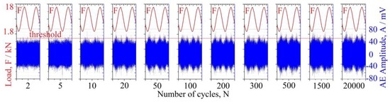 - AE does not reveal any periodicity in appearance of transient signals associated with brittle fracture due to fatigue crack advance. The latter occurs typically at the maximum cyclic load [1,2]. The AE stream is formed by continuous-like signals, thus making it impossible to use any traditional hit detection approach based on an amplitude threshold. For example, Figure 3 shows what would be recorded if the amplitude threshold was set as indicated by a red line. Obviously, the result of such a detection would not represent the real picture of damage development in terms of either the number of hits detected or their amplitude distribution. Therefore, the high ambiguity of the AE output obtained with the threshold-based detection prevents conclusive decisions regarding the fracture process and the damage state of the material.