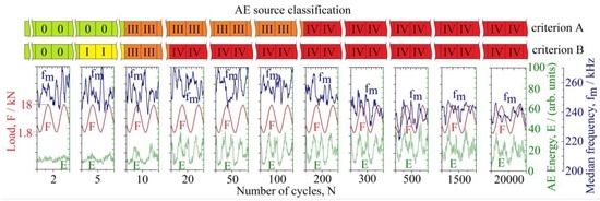 A diagram showing typical changes in the AE spectral parameters—energy and median frequency fm—with increasing number of cycles (these are typical for either room or lower temperature); the color-coded bars above the AE diagrams illustrate the procedures assigning the estimated rank of danger based on AE criteria proposed.