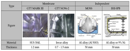 Recently, the demand for liquefied natural gas (LNG) is constantly increasing for the prevention of environmental pollution. In this trend, various types of LNG carriers have been developed and are operating worldwide. As shown in Figure 1, LNG carriers are divided into two categories—membrane and independent types, according to the classification of International Maritime Organization (IMO). The membrane-type tanks have a very thin primary barrier of Invar alloy or SUS 304L inside the cargo tank. The most common types of membrane-type tank are GTT Mark III and No. 96 types. Mark III consists of two layers of R-PUF (reinforced polyurethane foam) separated by triplex in order to configure an insulation system [1]. On the other hand, the No. 96 type composes a grillage structure made of plywood and filled with perlite in order to maintain tightness and insulation [2]. Independent-type tanks are perfectly self-supporting and do not come under a vessel’s hull structure. The most common types of independent-type tank are Moss and SPB types. The Moss-type tank system is formed in such a way that a self-supporting spherical tank of an aluminum alloy is fixed to the hull by a cylindrical support structure (skirt) [3]. The SPB type, which is an IMO independent Type B tank, is designed using an aluminum alloy or 9% nickel steel [4]. One of the most important issues in the design of various types of vessel is the structural integrity of storage tanks under cryogenic temperature. Therefore, LNG storage tanks are typically manufactured using low-temperature materials considering the operation temperature of LNG.
