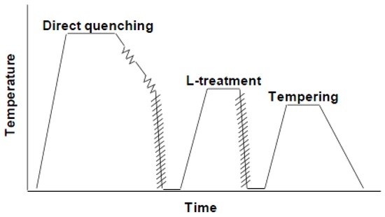 In this study, 7% nickel alloy steel was considered for replacing the conventional 9% nickel steel for LNG storage tanks. The chemical composition of 7% nickel alloy steel, considered in this study, is summarized in Table 2. The 7% nickel alloy steel in this study was treated with a thermo-mechanical control process (TMCP), as shown in Figure 2. The TMCP applied to direct quenching, lamerallizing, and tempering (DQ-L-T), in which lamerallizing was inserted between direct quenching and tempering, was utilized to form a more stable retained austenite, making it finely dispersed and increasing the content [9].