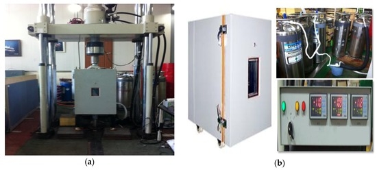 Test equipment: (a) servo hydraulic testing machine; (b) temperature control system.