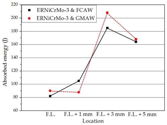 Figure 6 presents the Charpy-V impact test results for various locations of the HAZ. In the case of FCAW, F.L. exhibited the lowest impact absorbed energy, while GMAW had the lowest value at F.L. + 1 mm. This result is attributed to the difference in heat input from each welding process. For all locations, absorbed energies of GMAW were about 12% (the maximum) higher than those of FCAW except F.L. + 1 mm. Therefore, it appears that GMAW is slightly better than FCAW in terms of impact absorbed energy.