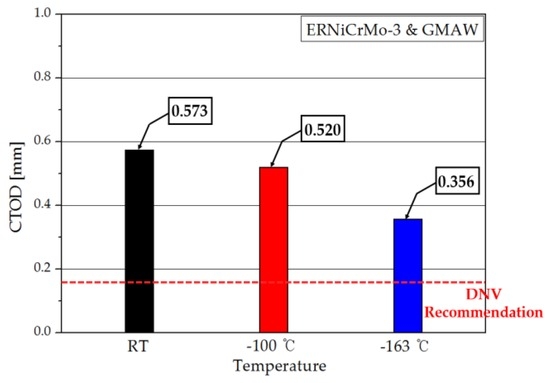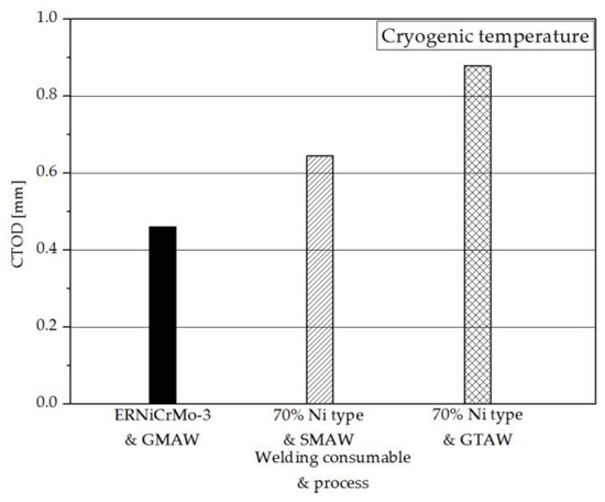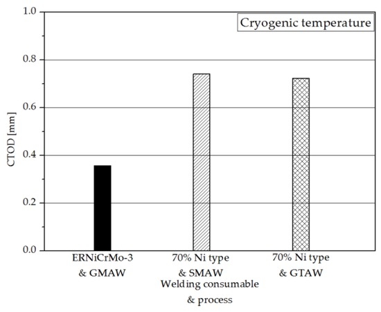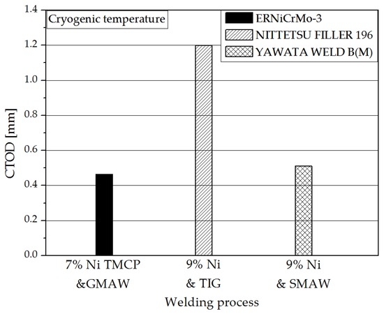 The CTOD values of the weldment of 7% nickel alloy steel were compared with those for 9% nickel steel considering welding processes, as indicated in Figure 11 [5].